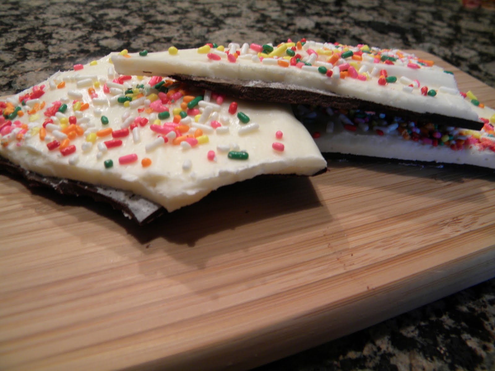 So today's lovely delectable is Birthday Cake Bark, made honor of my sister Mary who turned 30 this weekend, not that she got to have any considering she lives in Texas and I live in Illinois. Details always get me.